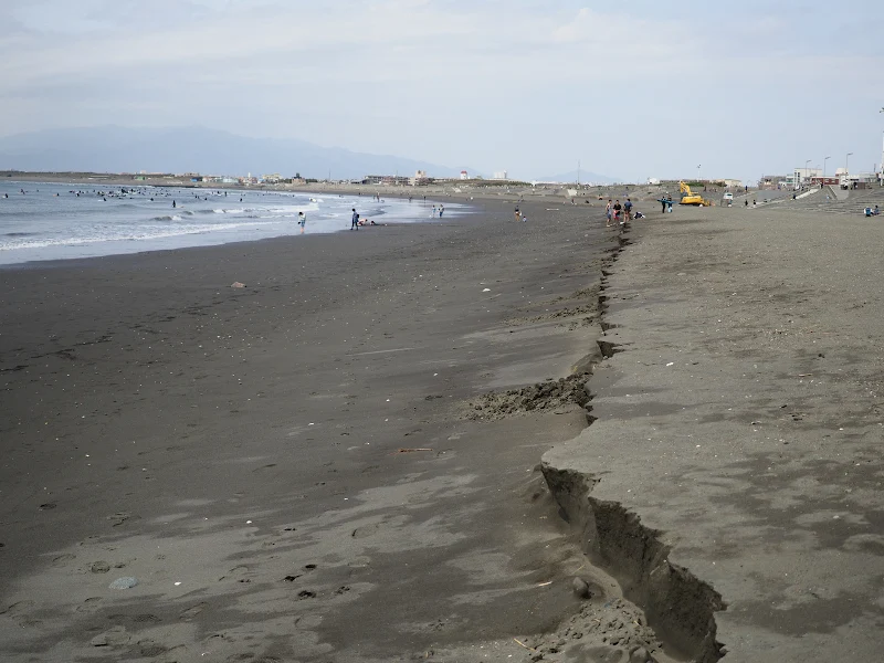 片瀬西浜の砂は、黒色軽石(スコリア)が主要粒子で、箱根山と富士山から噴出した岩石が相模川から海岸に沿って流れ着いたものだそうだ。だから飛砂しやすく、風が吹いたら凄い勢いで顔にビシビシ当たって痛いのかね。特性の異なる砂を入れても結局根付かず流出してしまうので、最終的に同じ性質の砂を投入するのが主流になったとか。最初にショベルカーを見たときはギョッとしたが、理由を知ると腑に落ちた。環境問題がどんどん身近なものになってますね。